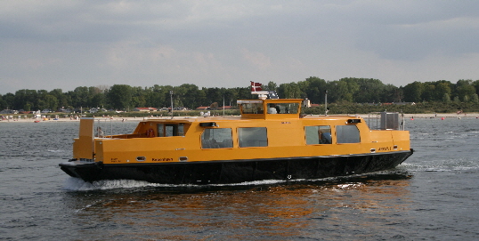 Effiziente, sehr maneuvrierfähige Doppelenderpassagierfähre mit Schottelantrieb, je einer hydraulisch absenkbaren Zugangsrampe an den Enden und barrierefreiem Zugang zum Fahrgastraum.